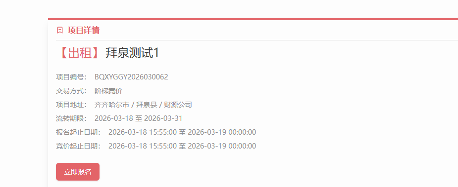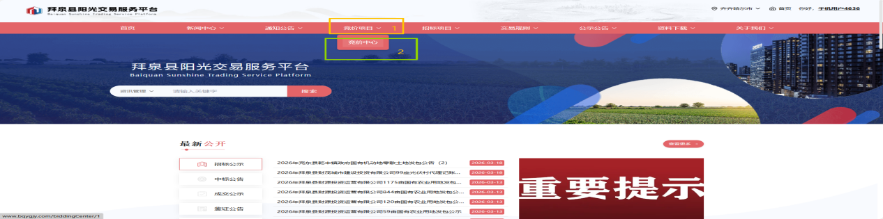 2.注册完成后,进入主页面鼠标轻触竞价项目,点击竞价中心,找到想要报名的项目,点击项目名称,进入项目详情页面