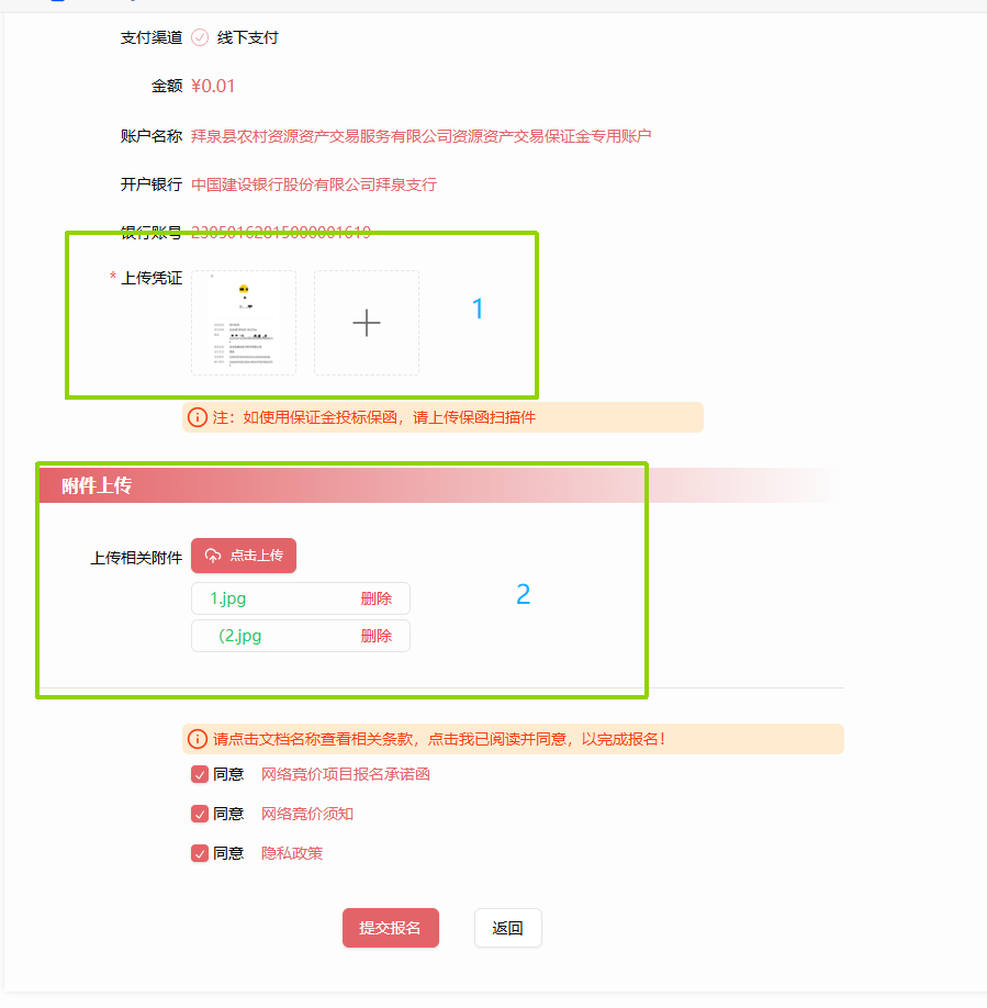 4. 进入报名页面后,上传凭证处将交好的保证金凭证或截图上传(保证金凭证上备注项目编号或项目名称均可),附件处上传本人的身份证正反面