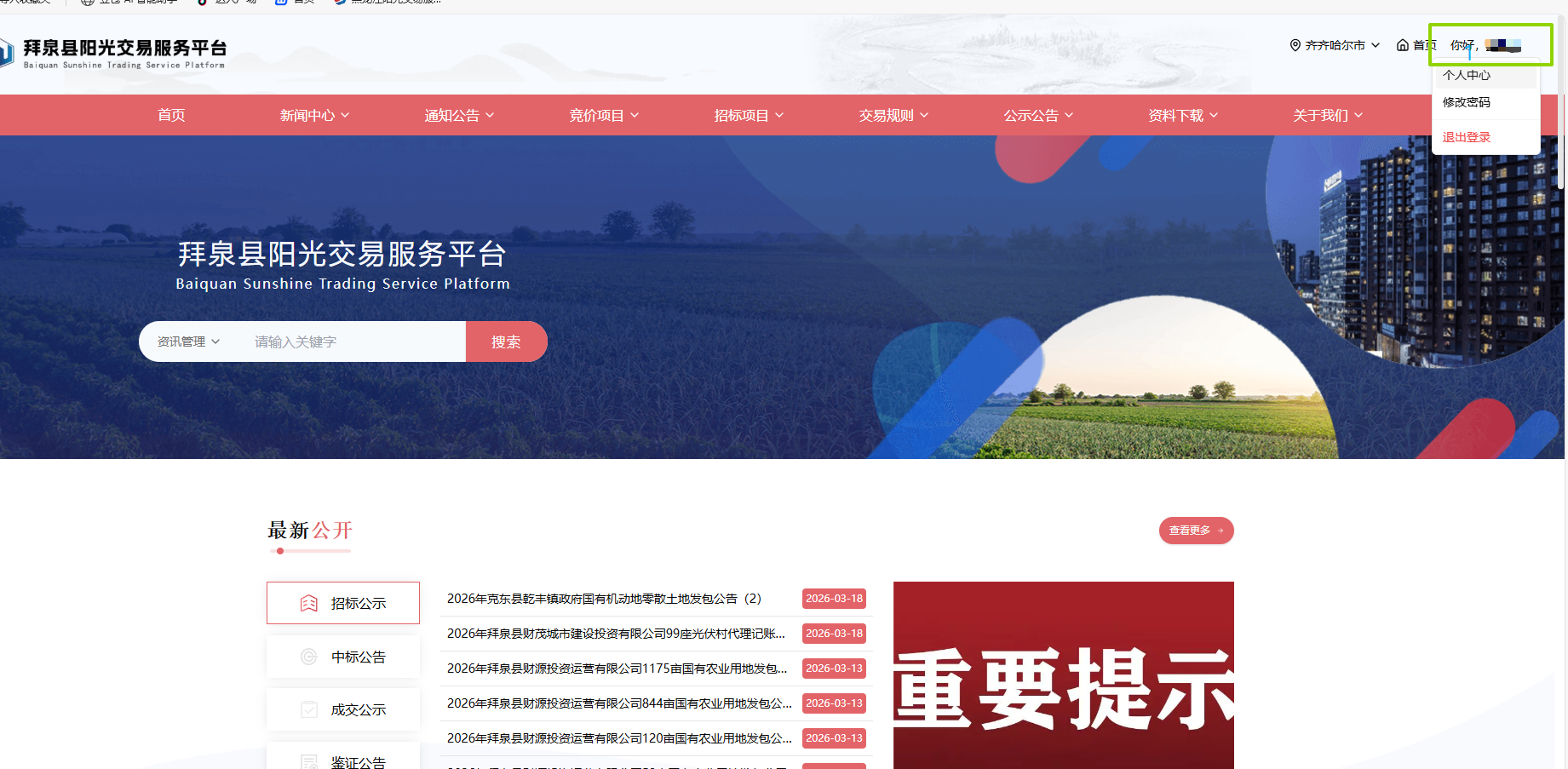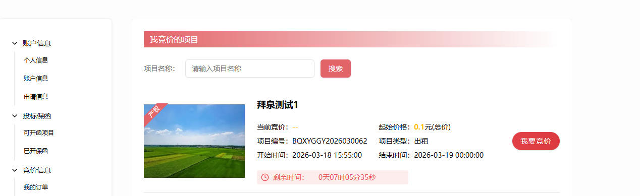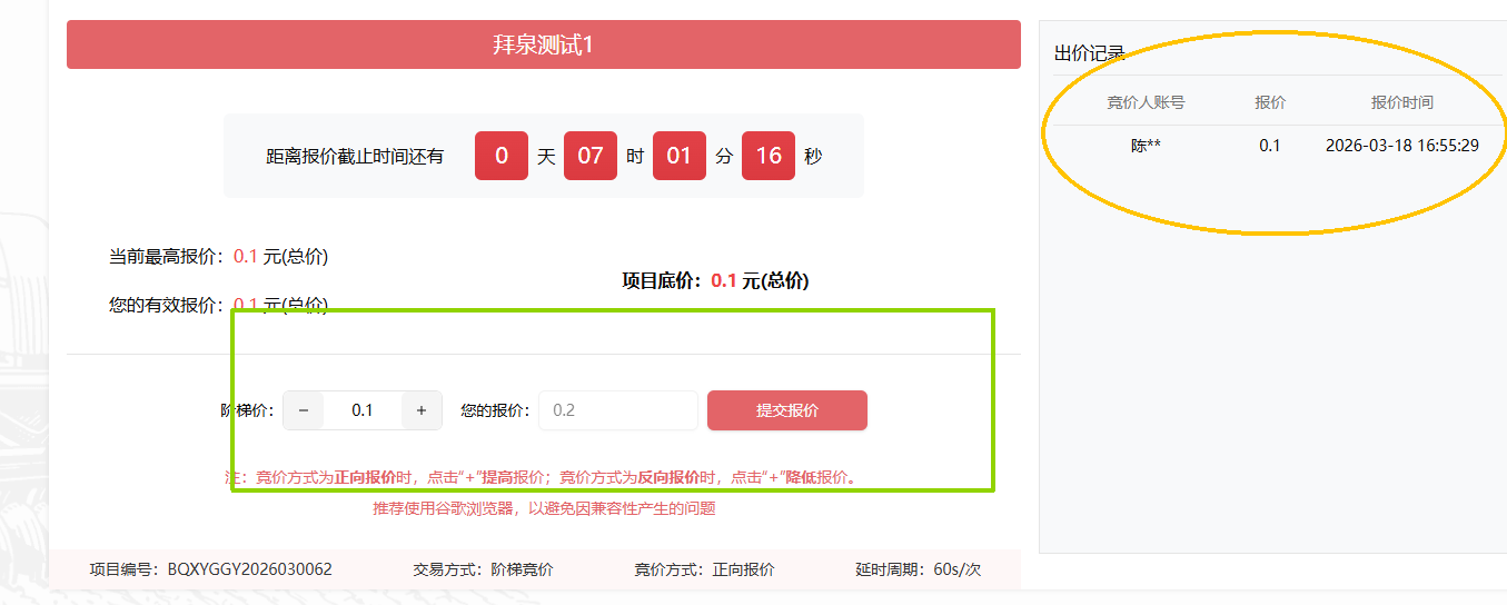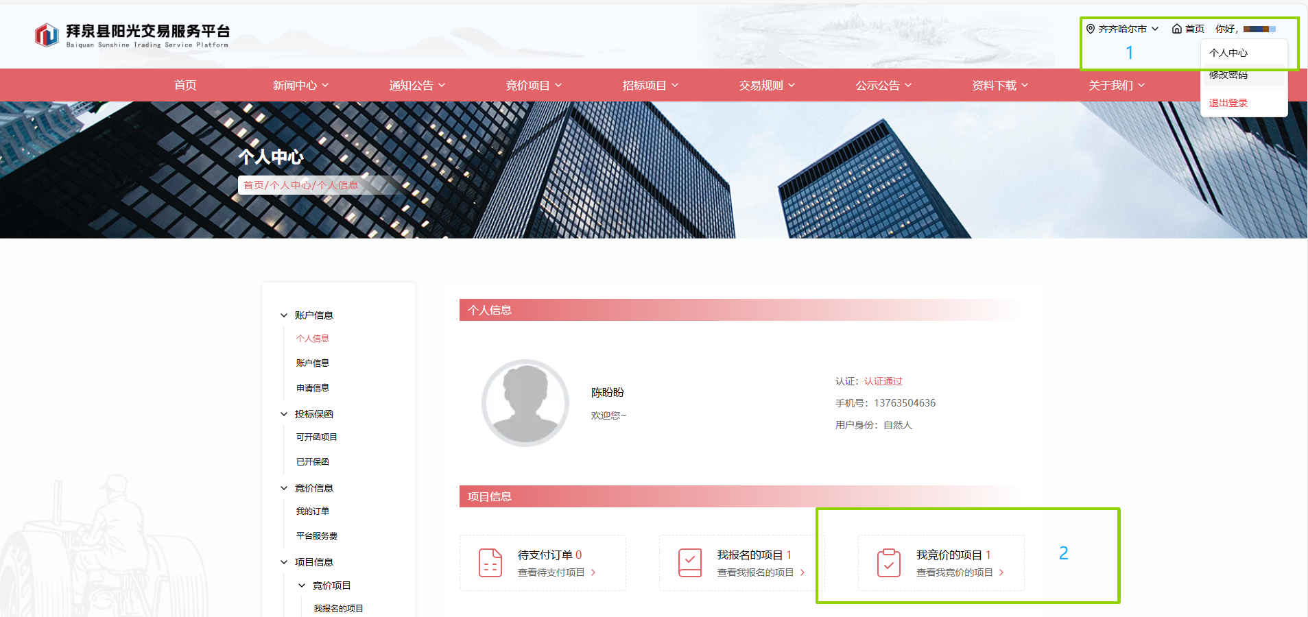 6. 报名完成后等待审核通过,审核通过后点击右上角姓名后再点击个人中心,进入页面后,点击我竞价的项目我要竞价,进入页面后点击提交报价,提交报价的同时,右边会显示出价记录,后续等待项目结束即可